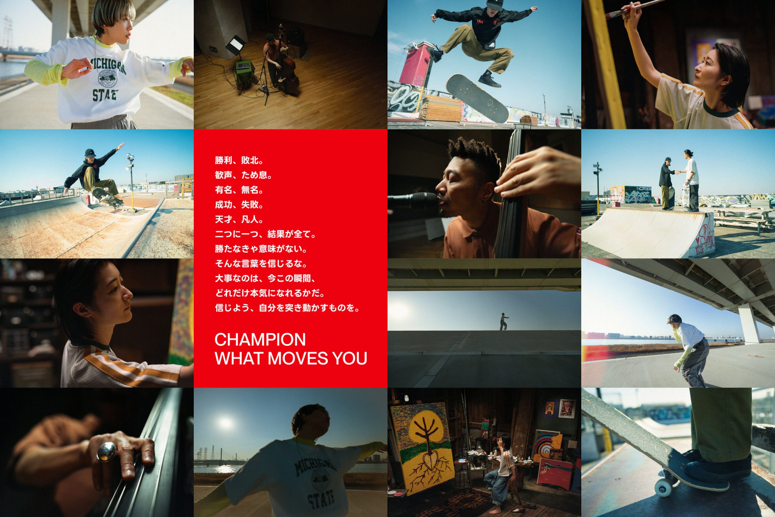 「たった一人のChampion(勝者)ではなく、誰もが持つ夢中をChampion(支持)する。」と言うブランドメッセージの浸透を目指し、100年以上続くブランドの歴史の中でこれまで支えてきたスポーツやカルチャーの一つであるバスケットボール、ダンス、スケートボード、音楽、アートに情熱を注ぐ人たちを「結果ではなく、過程。」「勝ち負けではなく、本気かどうか。」「決められた枠にはまらず、自分が選らんだ道を信じているか。」と言う視点で、それぞれが夢中にある瞬間を描くキャンペーンを実施。