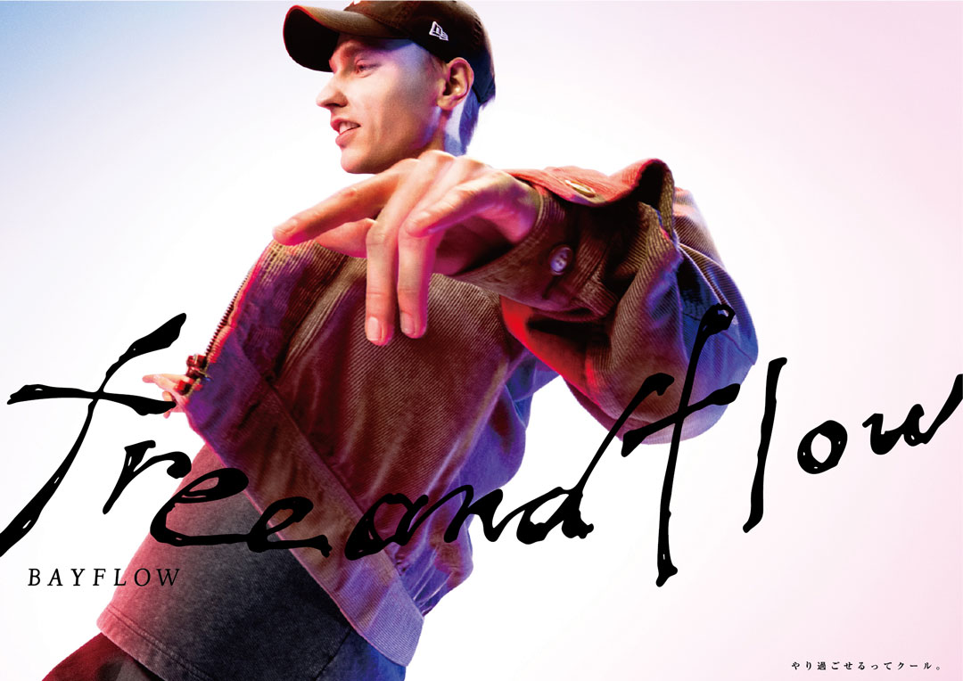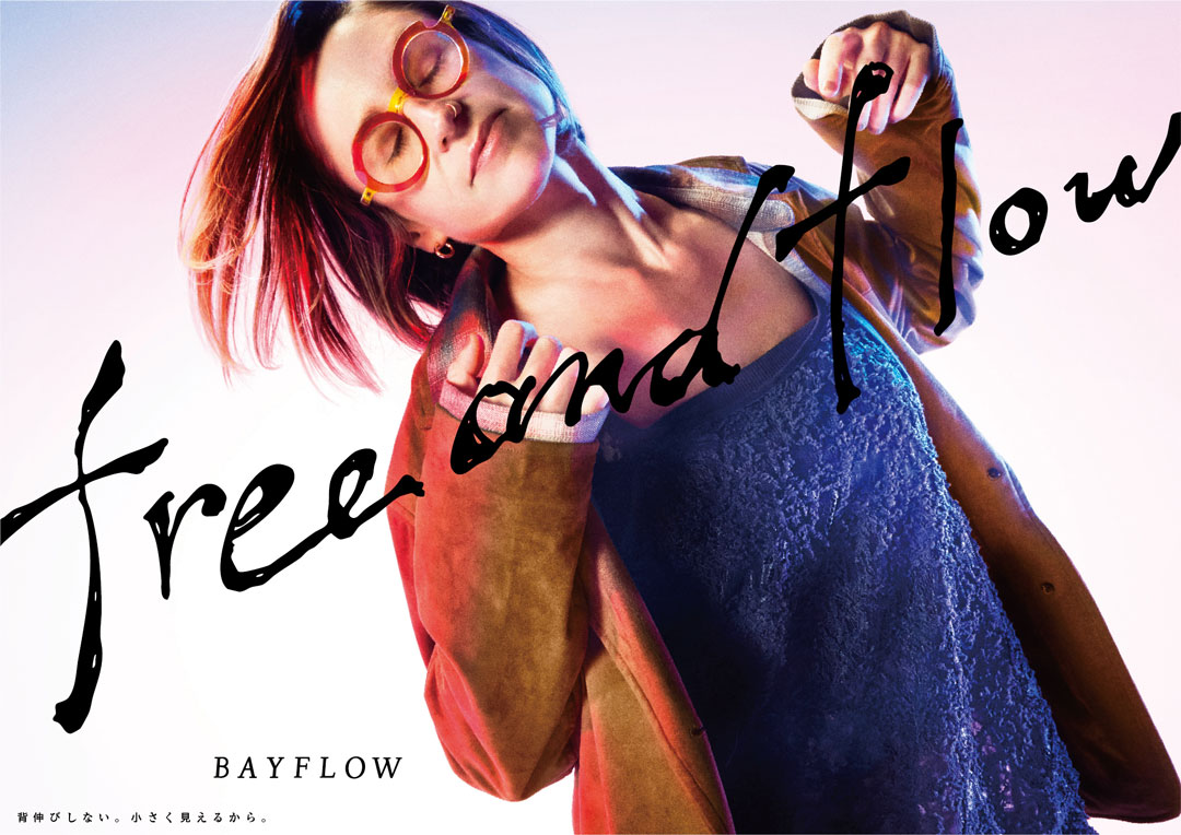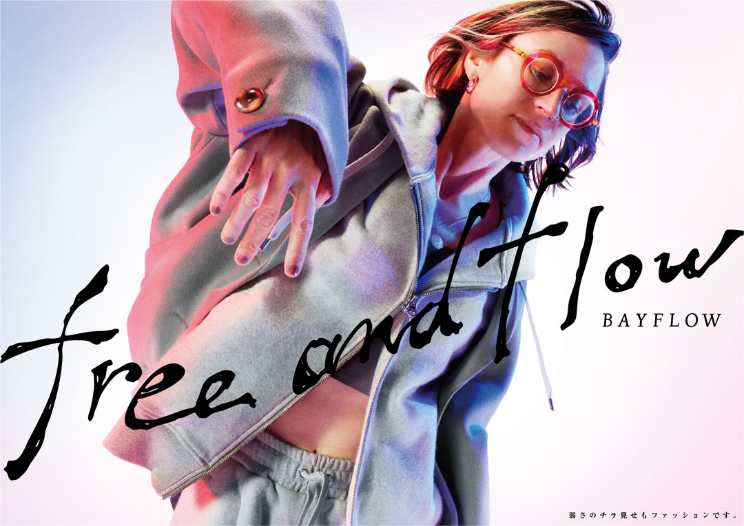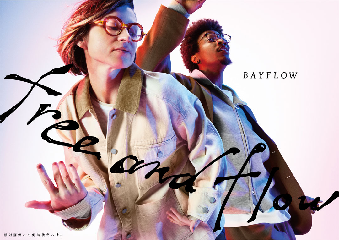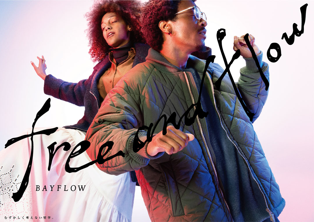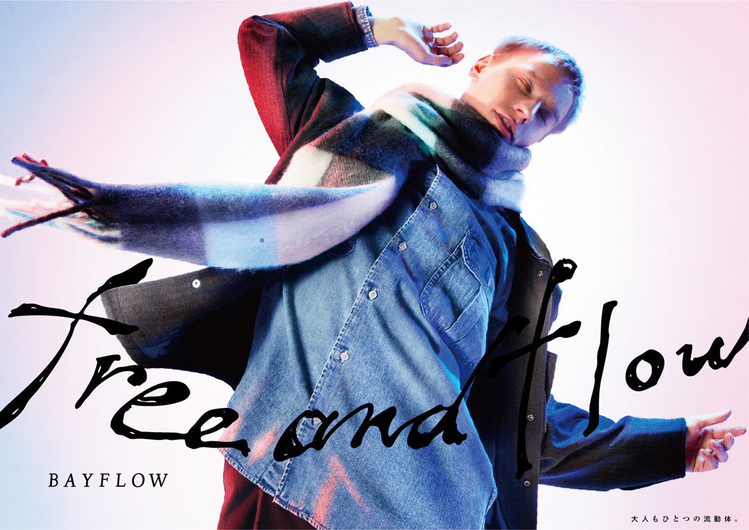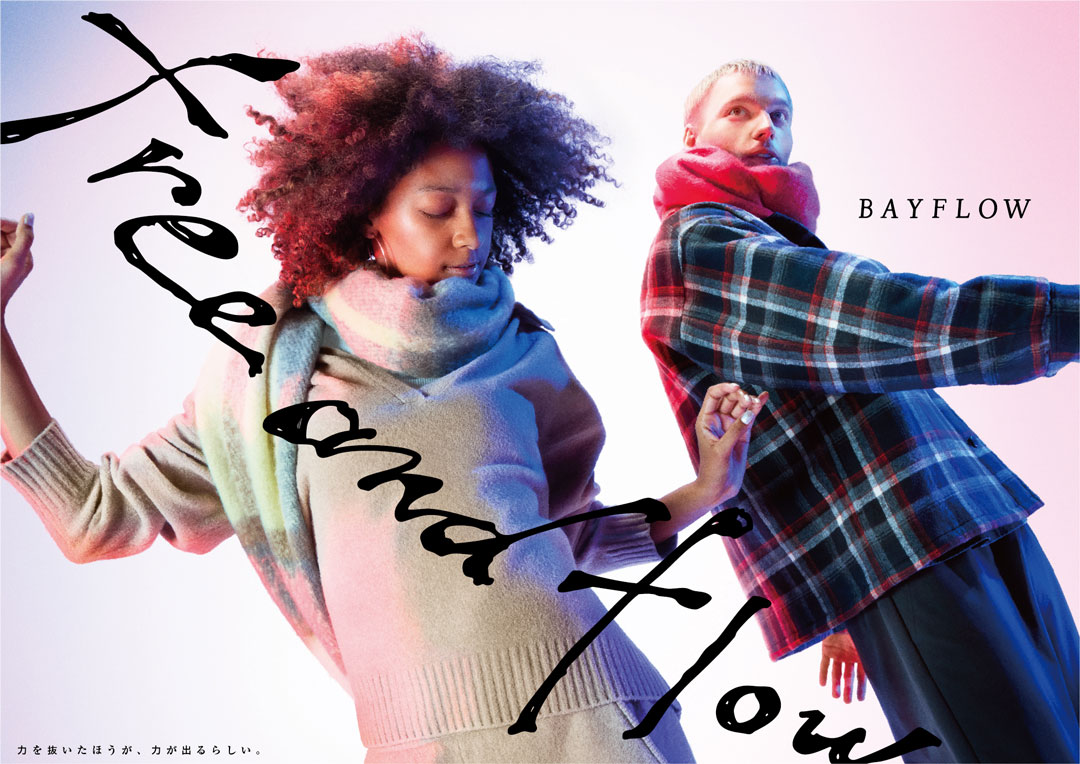 free & flow 25FW Adastria Co., Ltd./ BAYFLOW GraphicPromotion BAYFLOW「free & flow」の 25FW版キーグラフィック。「自分を自由に行き来」できる素敵な大人の姿を、音楽に乗って思わず体を揺らしてしまう人たちの自由で流れるような気分で表現。背景は、ボーダレスな感覚を表す様、白ホリのスタジオで被写体の左右からBAYFLOWのブランドカラーである赤と青のライトを当て、キャッチコピーの「free&flow」は、抜け感のある、気張らない様を手描きで表すことで、自分で自分を決めつけない大人へのメッセージ浸透を目指した。